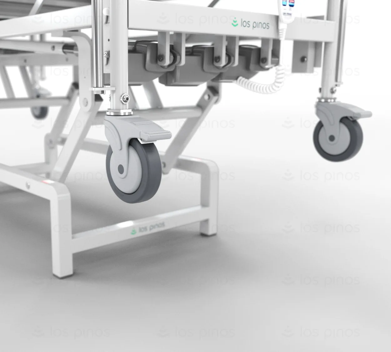 La cama esta equipada con ruedas de 5” con sistema de freno individual que brinda seguridad y facilidad en el transporte. Libres de mantenimiento, silenciosas y no recolectan hebras o mugre.