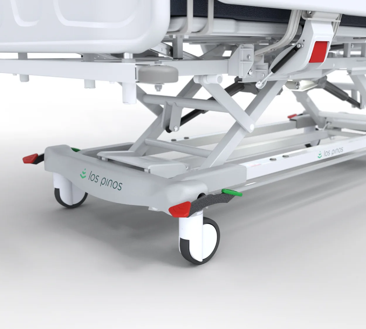 La quinta rueda proporciona un giro adicional y facilita el movimiento en espacios reducidos, permitiendo al personal médico ajustar la posición del paciente con precisión y rapidez.